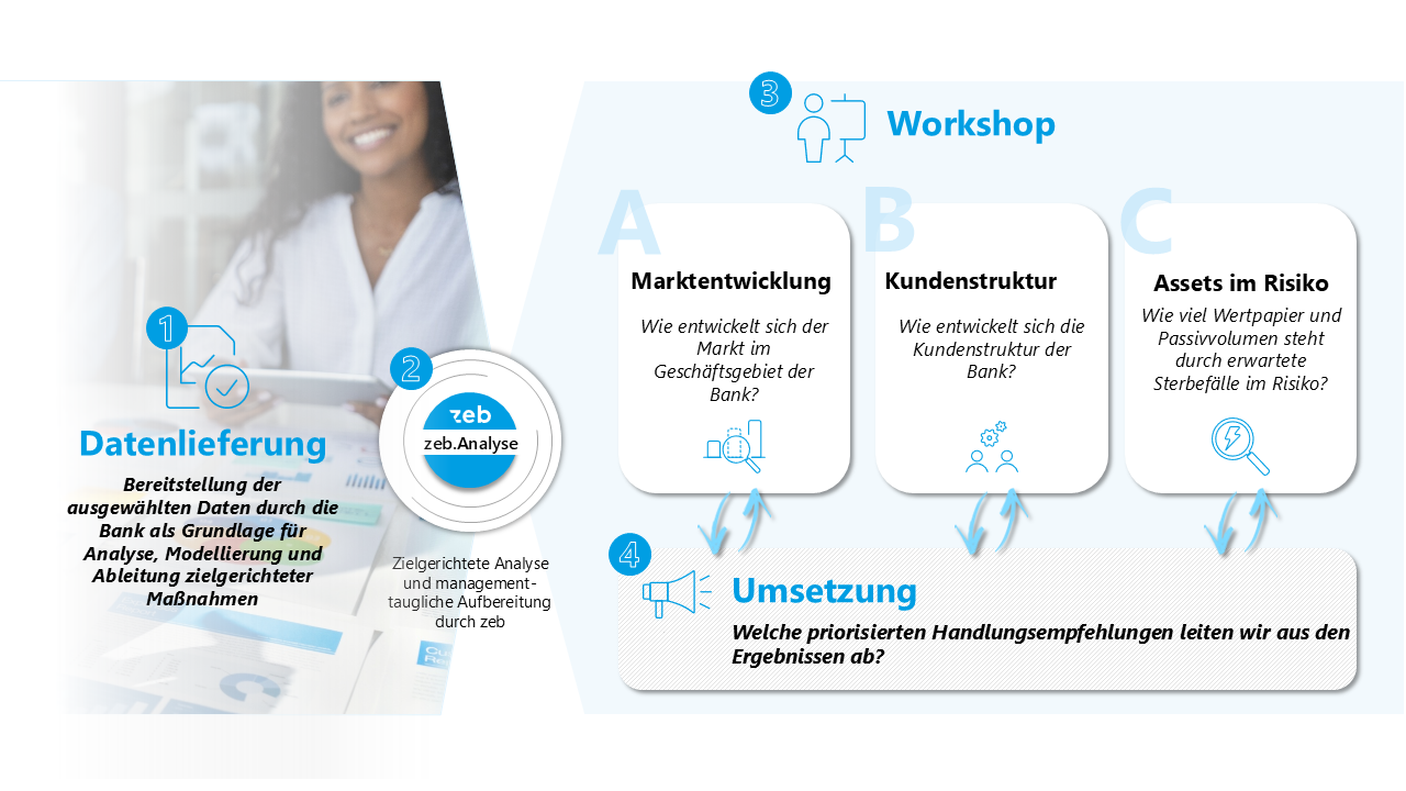 - Präzise Vermögensprognosen mit jährlicher Auswertung durch zeb-Rechenmodell – bankindividuelle Inputfaktoren werden berücksichtigt