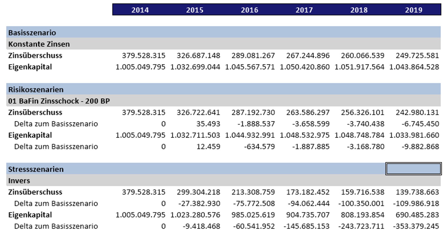 - mehrjährigen periodischen Szenarioanalysen (z.B. Risiko- und Stressszenarien, auch für die NZU oder den EBA-Stresstest / STE) unter Berücksichtigung von periodischen Bewertungseffekten