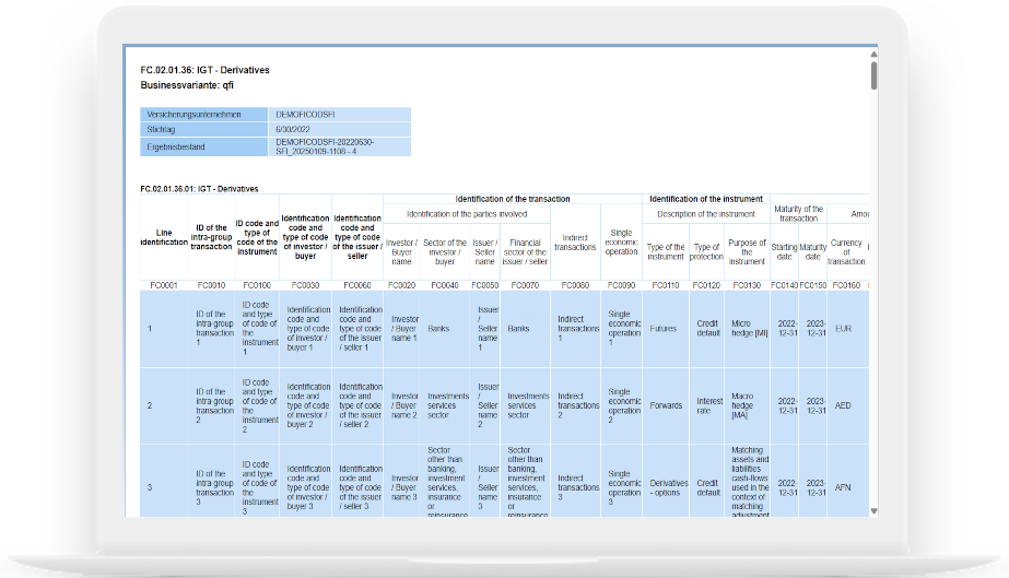 Data is provided via a user-friendly interface in the form of reporting templates, which are also used to display data within the software. The XBRL format for reporting is automatically generated, and an XBRL validation process is carried out with clear error reporting and additional correction options based on the EIOPA taxonomy. As part of an approval process, both individual reports and the entire submission undergo a four-eyes principle review before the final reporting file is downloaded in XBRL format and submitted to the supervisory authority.