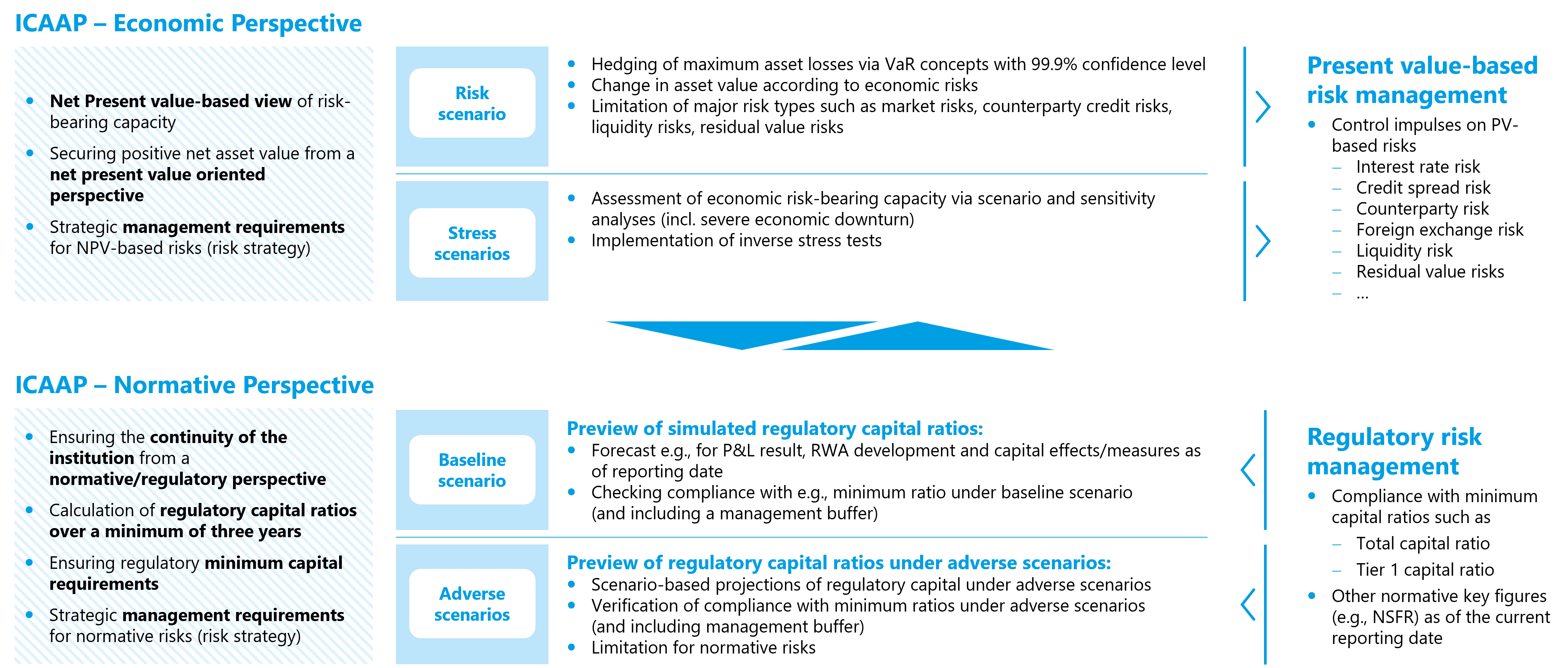Integrated risk measurement and comprehensive simulation of risk metrics including ICAAP/ ILAAP metrics.