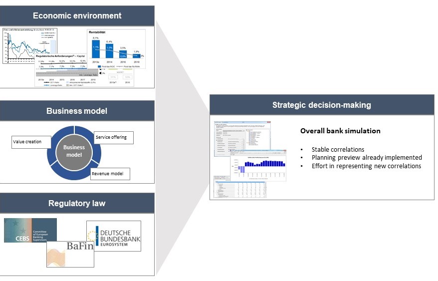 As a result of the volatile market environment, intensified competition and new regulatory requirements, transparency of key management indicators has increasingly become a critical success factor for banks. An overall representation of interdependencies between balance sheet structure, P&L, central management parameters and regulatory restrictions is indispensable for target-oriented and robust business planning.