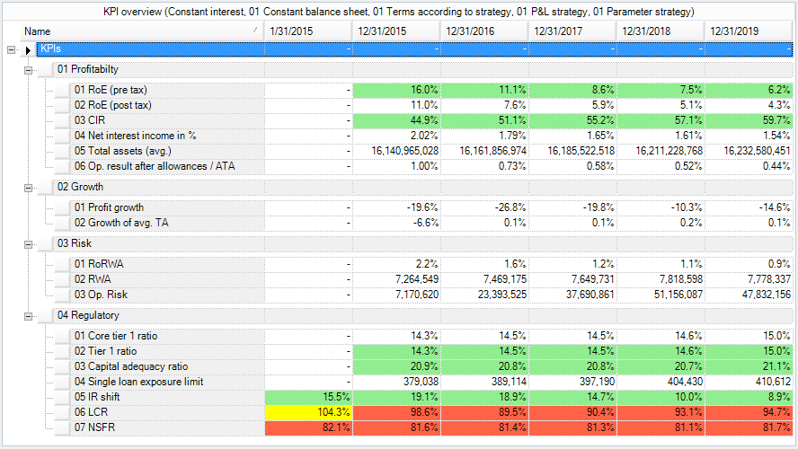 - Integrated simulation of all relevant target indicators, such as return on equity, cost-income ratio, growth indicators for P&L and balance sheet, or regulatory indicators, such as core capital ratio, leverage ratio, Basel II interest risk coefficient, and Basel III liquidity indicators, such as liquidity coverage ratio and net stable funding ratio