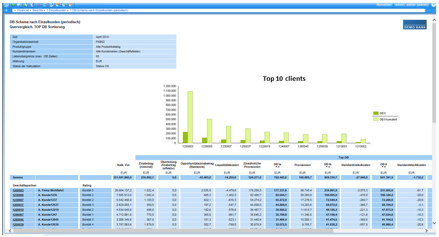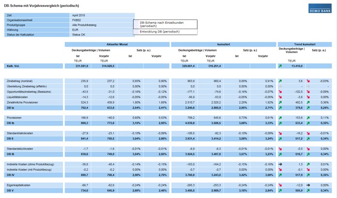 • Extensive and, depending on the business model, predefined indicator library (e.g. contribution margin components from the FTP calculation engine, RoA, net new money, assets under management, with easy expandability and configurable management parameters